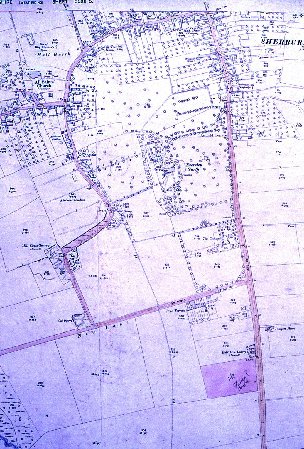 | Old map of Sherburn showing the locations of Eversley House, The Cottage, The Corn Mill |