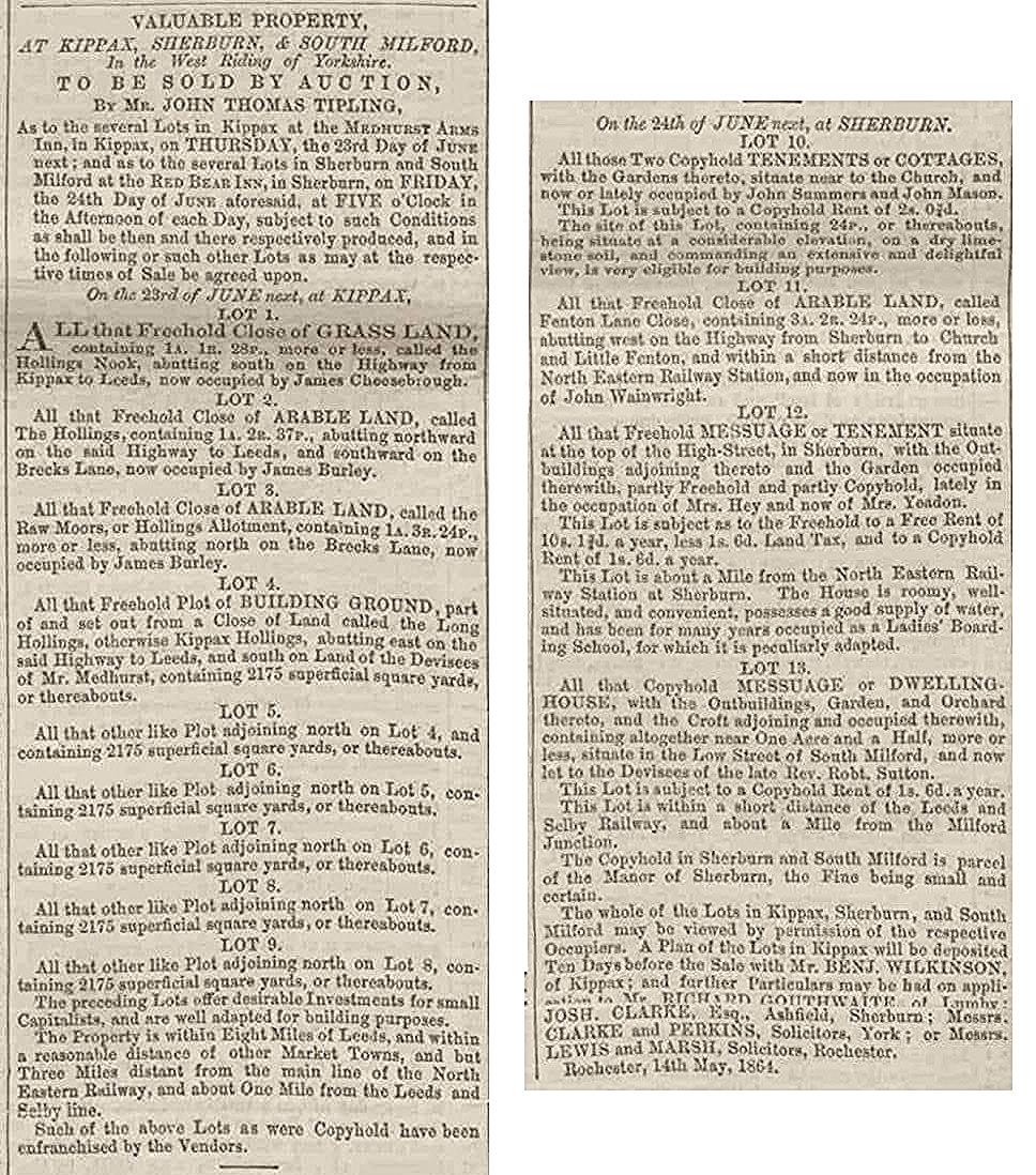 | Details of an auction held at the Red Bear Inn (Lots 10,11,12) ~ 24 June 1864 |